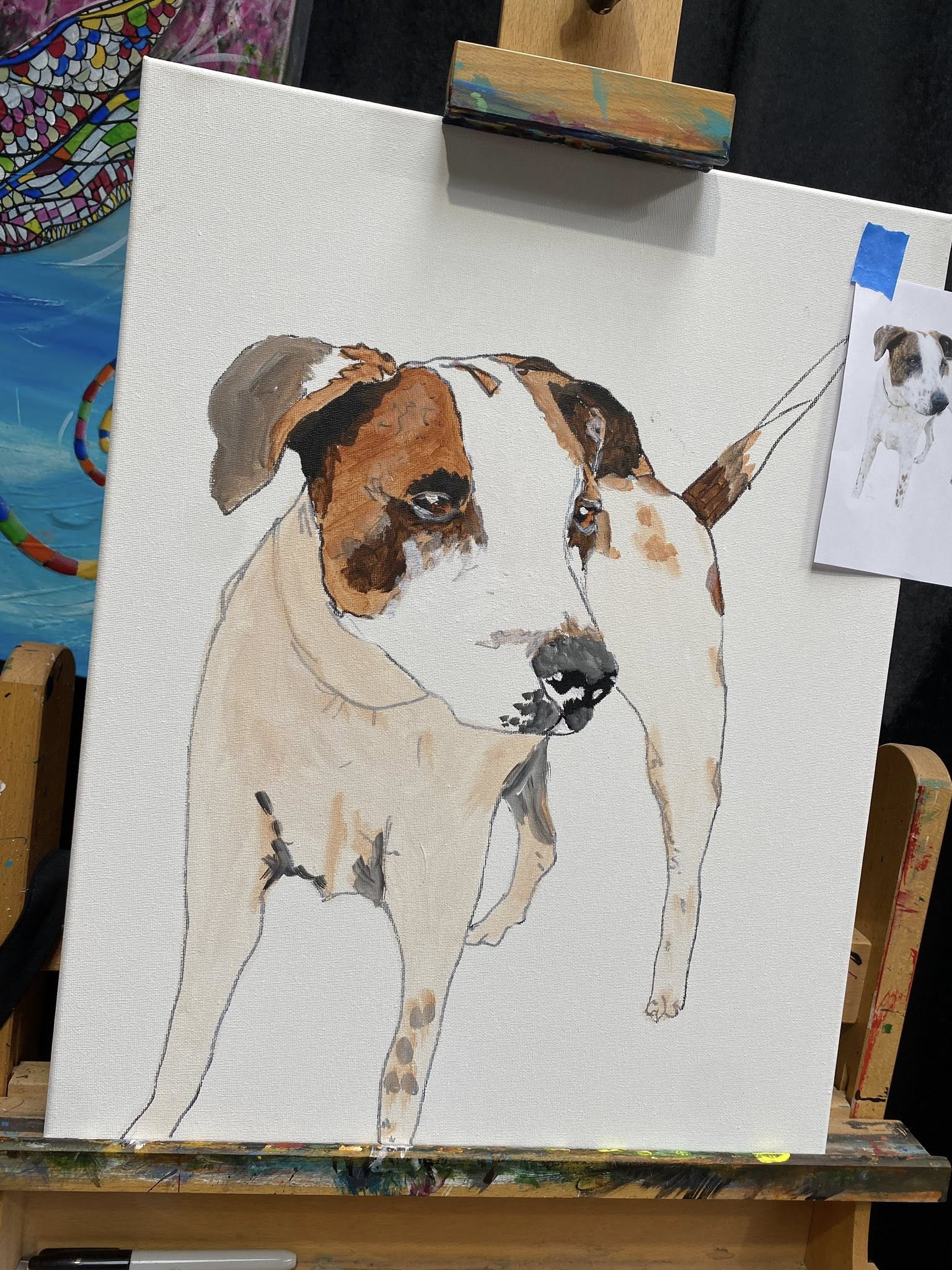 Send us a photo of your pet before the session and we’ll sketch it onto the canvas for you. On the day, we guide you step by step β€” starting with base colours, then building layers and adding those final details that bring your pet to life.